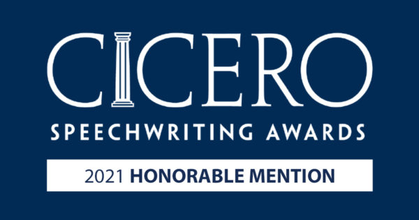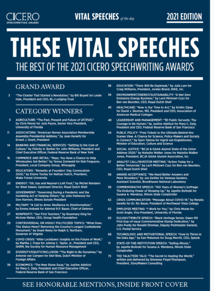 The speech is featured on page 16 of “These Vital Speeches: The Best of the 2021 Cicero Speechwriting Awards,” a commemorative anthology of the winning speeches now posted on the Cicero Speechwriting Awards website.